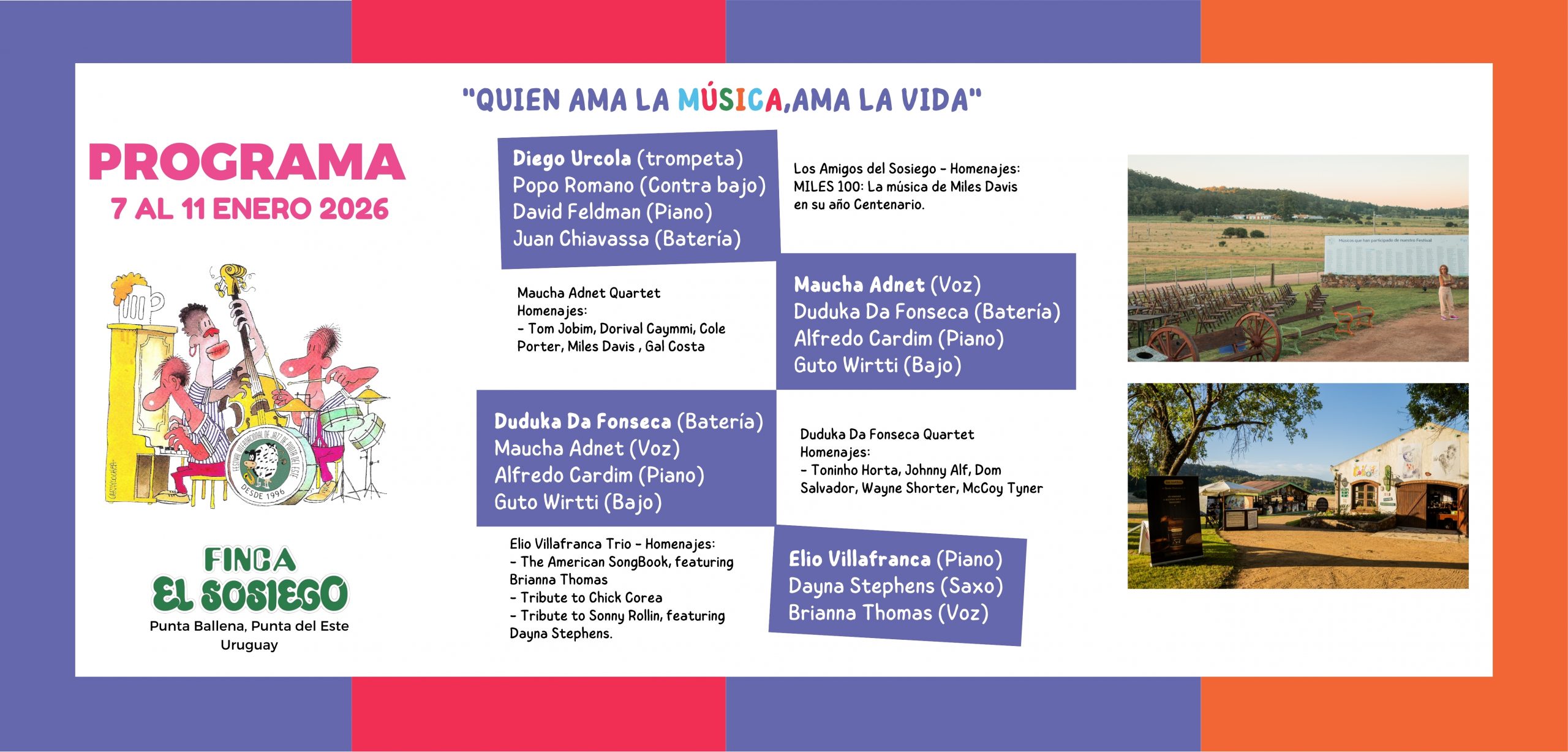 El jazz es una música simple: ritmo, melodía y armonía. Pero al mismo tiempo, de mucha variedad, y esto es lo que se escuchará en la FINCA EL SOSIEGO de Punta Ballena, Punta del Este. Cuatro días de swing, cuatro días de magnifica música, cuatro días de jazz puro… ¡y mucho más!